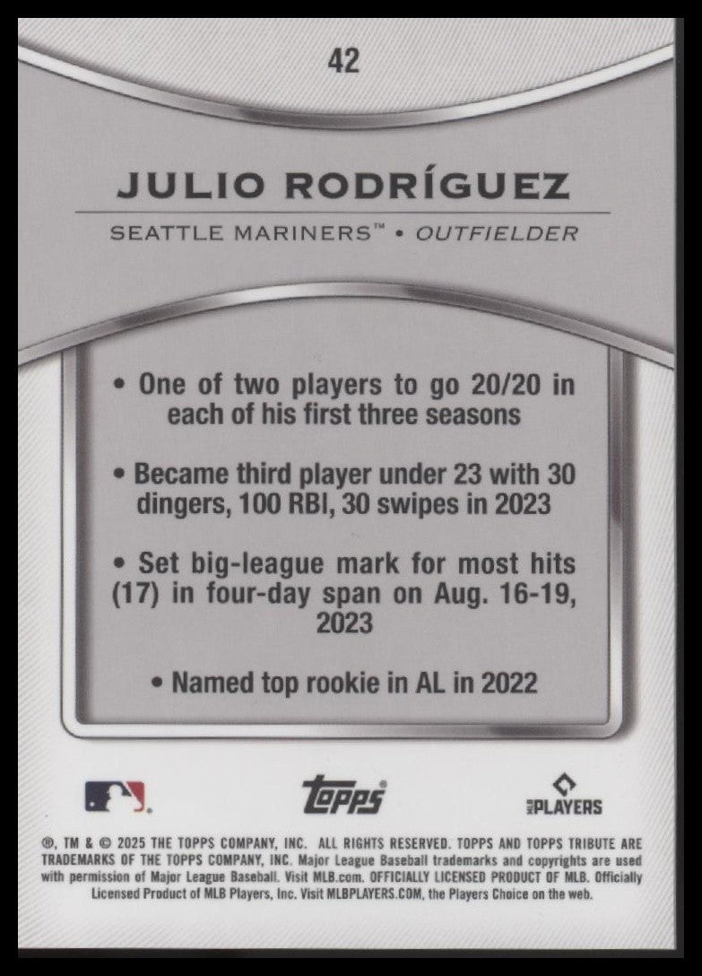 This is a sharp example of the 2025 Topps Tribute #42 featuring Julio Rodríguez.