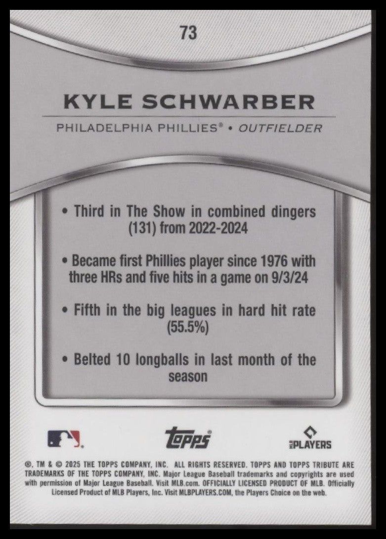 This is a sharp example of the 2025 Topps Tribute #73 featuring Kyle Schwarber.