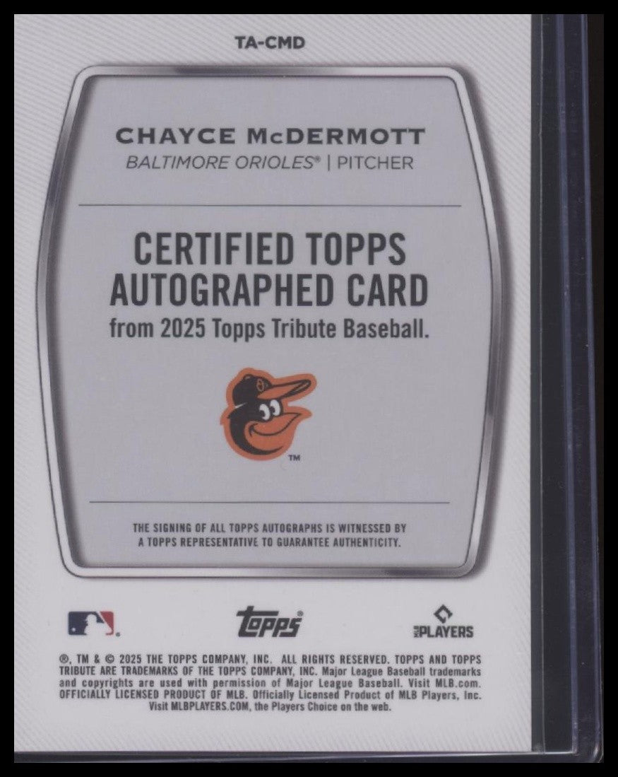 Chayce McDermott played for the Baltimore Orioles in 2025, and this card is a standout from the Topps 2025 Topps Tribute release. Whether you're chasing rookies, SSPs, or building a premium collection, this card delivers.