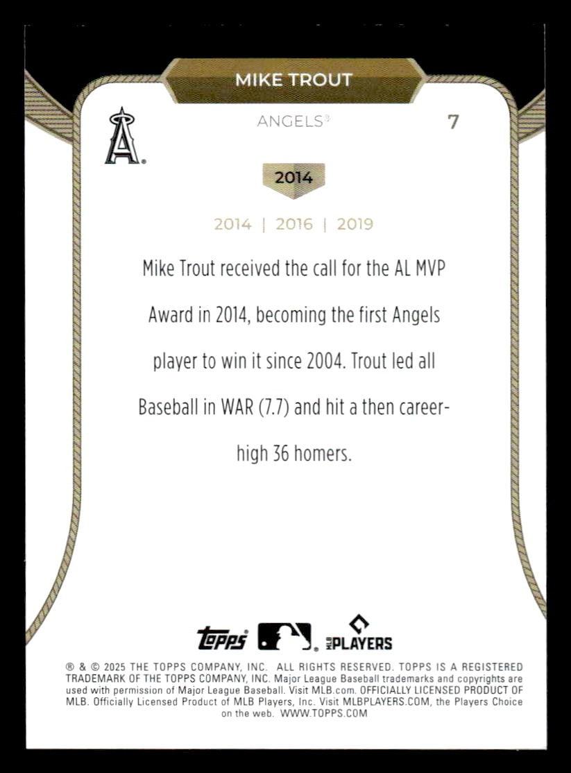 This is a nice example of a 2025 Topps Welcome to the Club: 3X MVP #7 Mike Trout