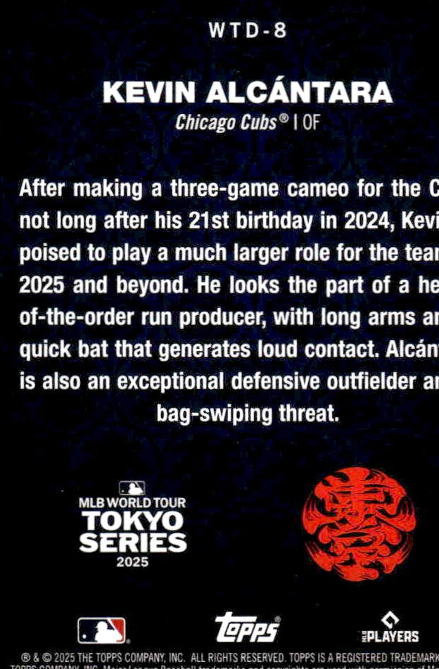 This is a nice example of a 2025 Topps #WTD-8 Kevin Alcántara World Tour Domination