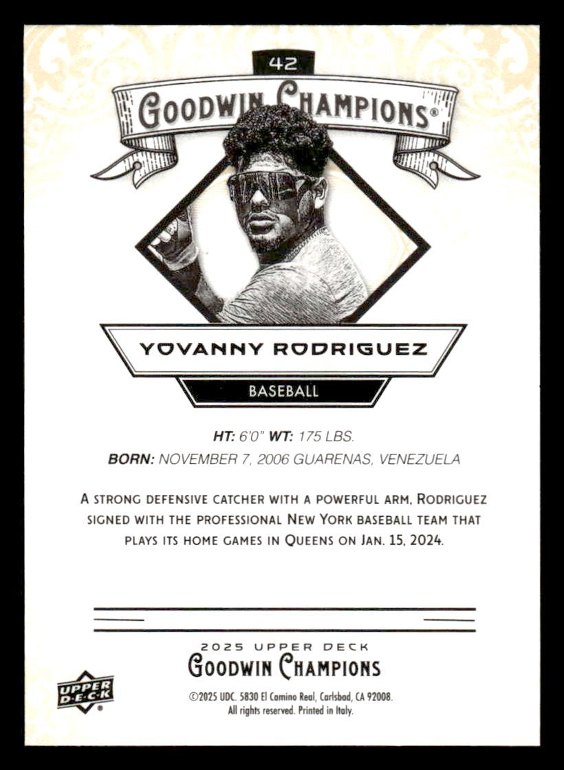 This is a sharp example of the 2025 Upper Deck Goodwin Champions #42 featuring Yovanny Rodriguez.