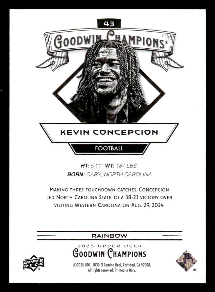 Kevin Concepcion played for the Texas A&M Aggies in 2025, and this card is a standout from the Upper Deck 2025 Upper Deck Goodwin Champions release. Whether you're chasing rookies, SSPs, or building a premium collection, this card delivers.