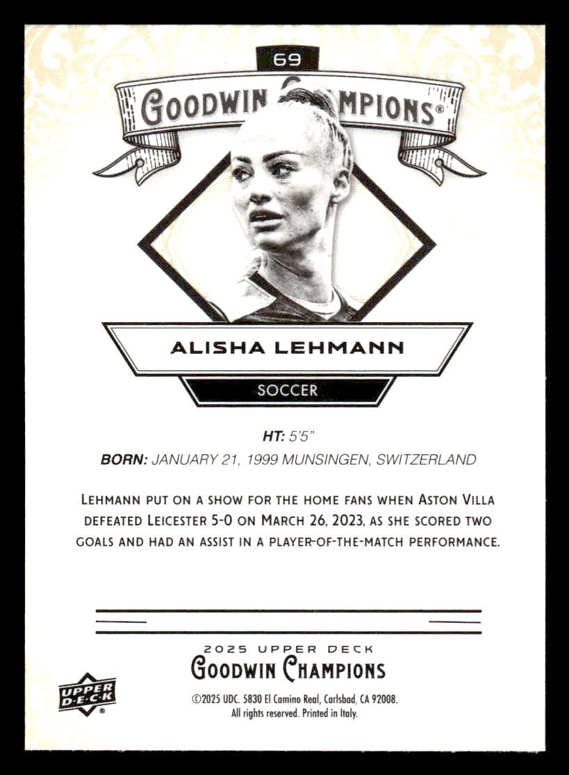 This is a sharp example of the 2025 Upper Deck Goodwin Champions #69 featuring Alisha Lehmann.