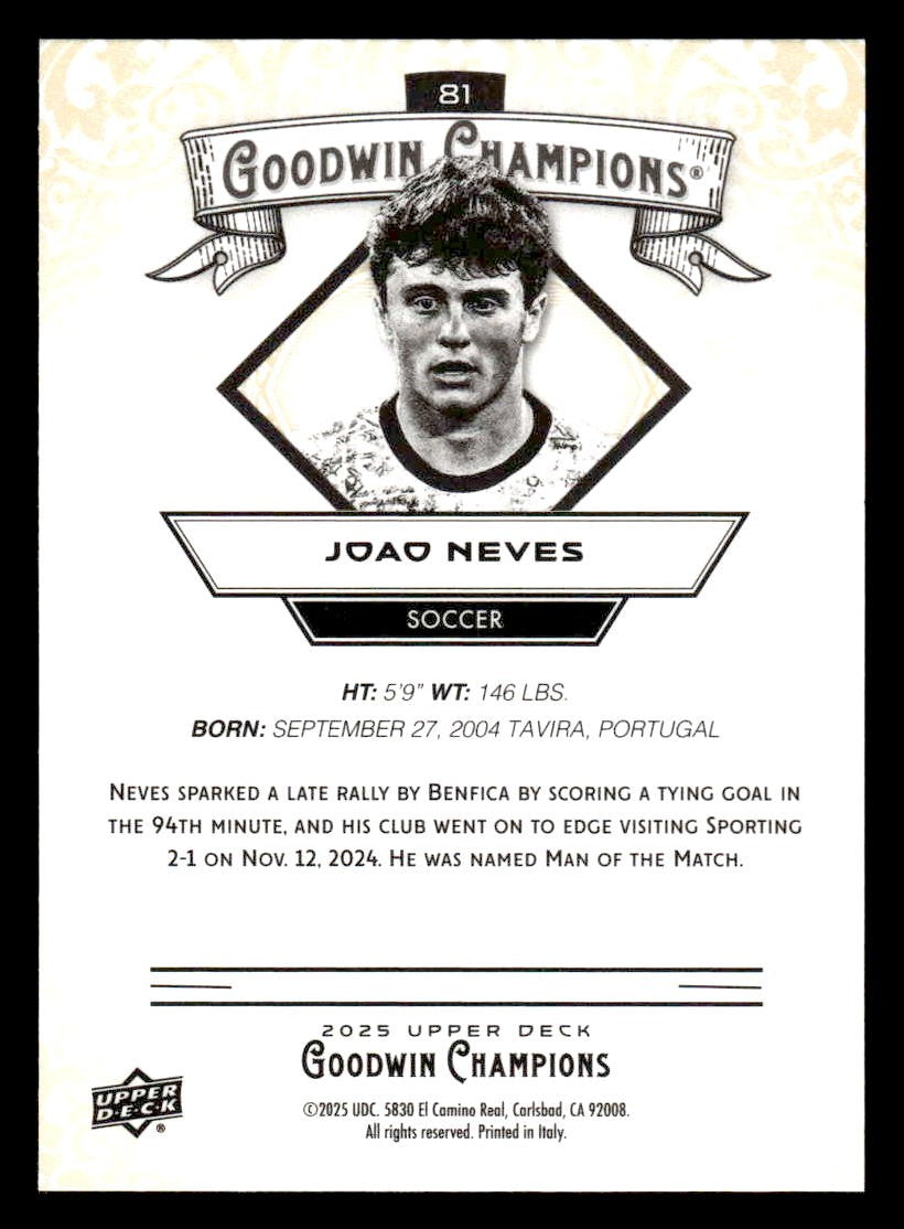 This is a sharp example of the 2025 Upper Deck Goodwin Champions #81 featuring Joao Neves.