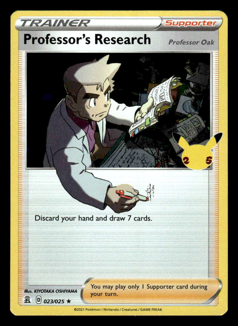 This is a nice example of a Celebrations #023/025 Professor's Research .Other important information about this card: Holo Rare.Please check out our other listings for more great cards.