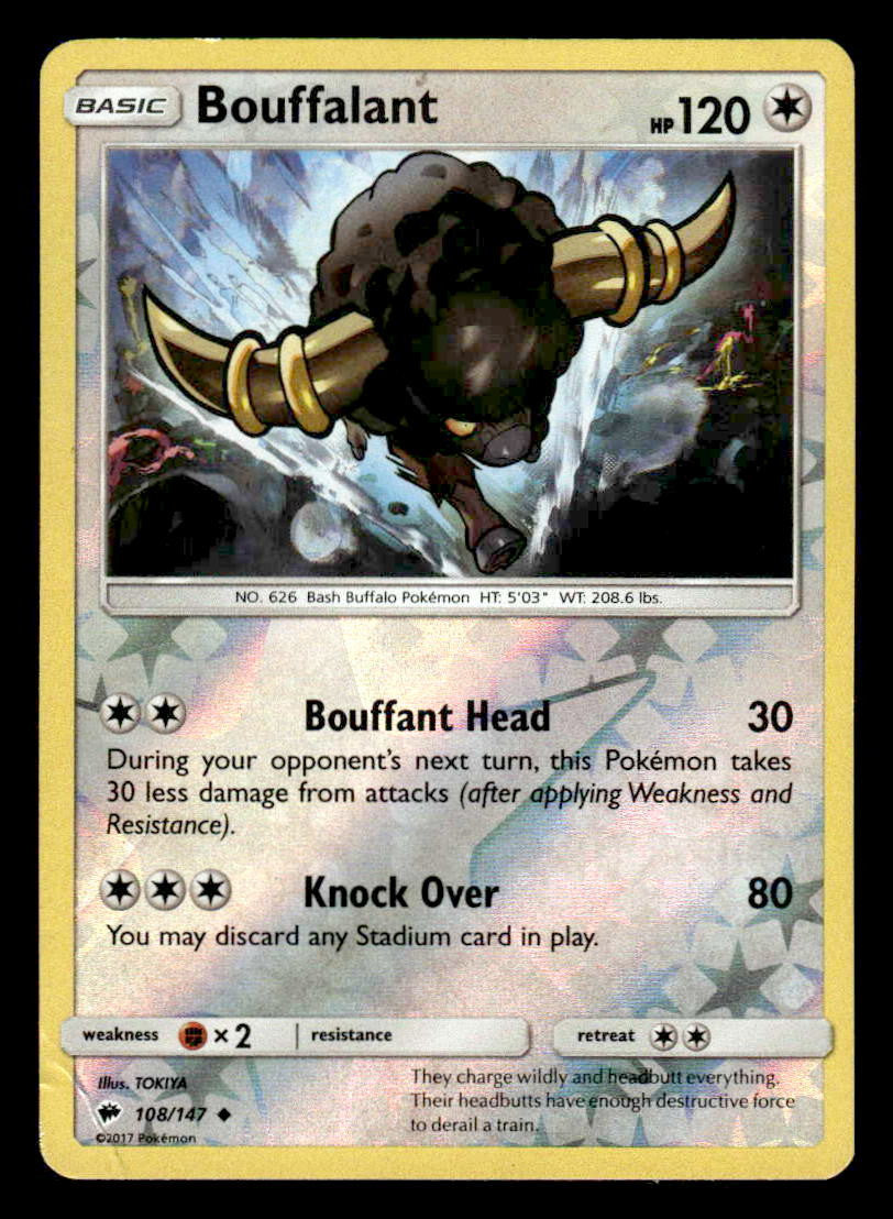This is a nice example of a SM - Burning Shadows #108/147 Bouffalant .Other important information about this card:Reverse Holo Uncommon.Please check out our other listings for more great cards.