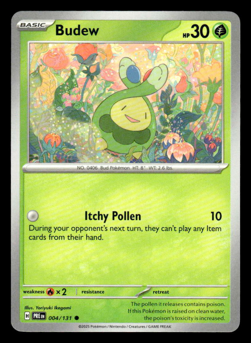 This is a nice example of a SV: Prismatic Evolutions #004/131 Budew .Other important information about this card: Common.Please check out our other listings for more great cards.