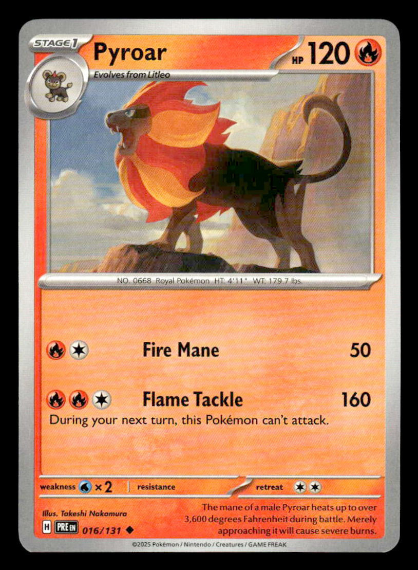 This is a nice example of a SV: Prismatic Evolutions #016/131 Pyroar .Other important information about this card: Uncommon.Please check out our other listings for more great cards.