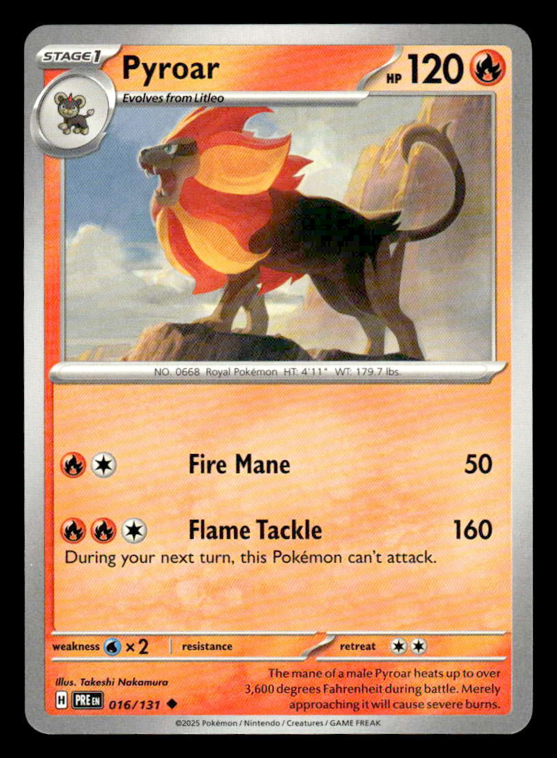 This is a nice example of a SV: Prismatic Evolutions #016/131 Pyroar .Other important information about this card: Uncommon.Please check out our other listings for more great cards.