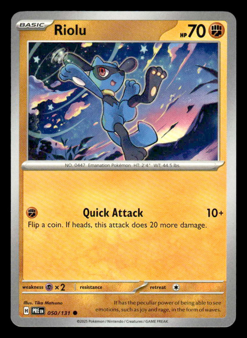 This is a nice example of a SV: Prismatic Evolutions #050/131 Riolu .Other important information about this card: Common.Please check out our other listings for more great cards.