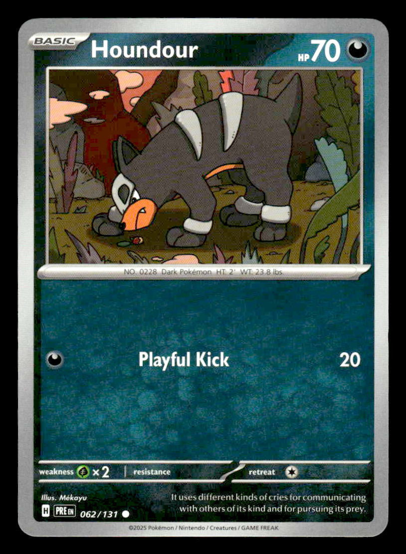This is a nice example of a SV: Prismatic Evolutions #062/131 Houndour .Other important information about this card: Common.Please check out our other listings for more great cards.