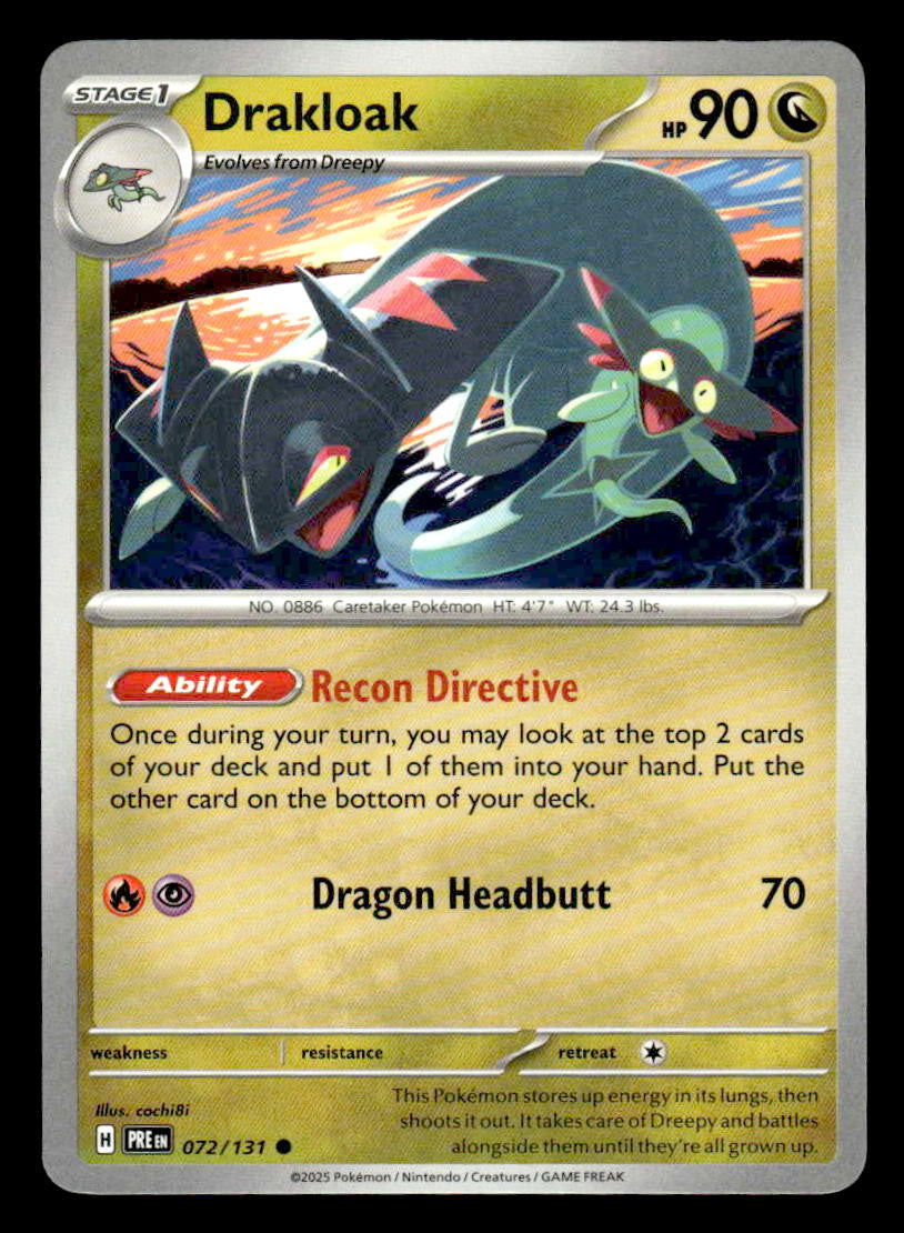 This is a nice example of a SV: Prismatic Evolutions #072/131 Drakloak .Other important information about this card: Common.Please check out our other listings for more great cards.
