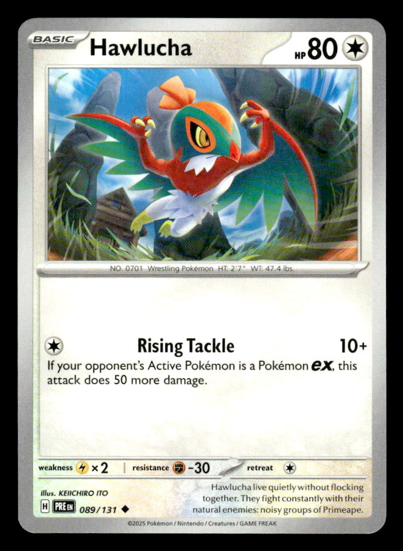 This is a nice example of a SV: Prismatic Evolutions #089/131 Hawlucha .Other important information about this card: Uncommon.Please check out our other listings for more great cards.
