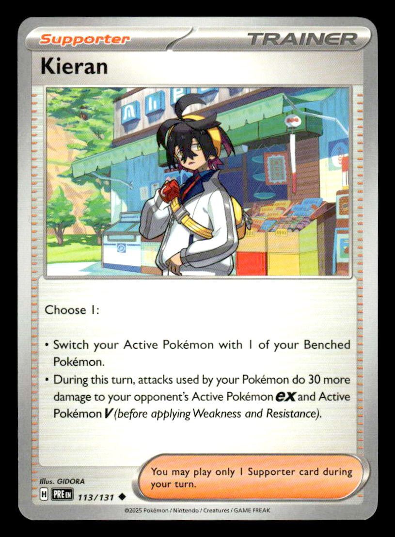 This is a nice example of a SV: Prismatic Evolutions #113/131 Kieran .Other important information about this card: Uncommon.Please check out our other listings for more great cards.