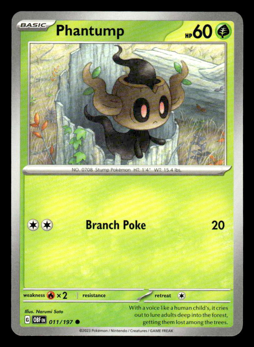 This is a nice example of a SV03: Obsidian Flames #011/197 Phantump .Other important information about this card: Common.Please check out our other listings for more great cards.
