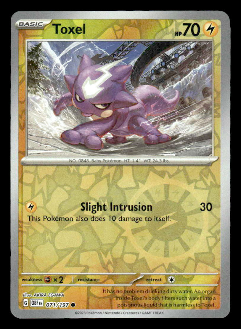 This is a nice example of a SV03: Obsidian Flames #071/197 Toxel .Other important information about this card:Reverse Holo Common.Please check out our other listings for more great cards.