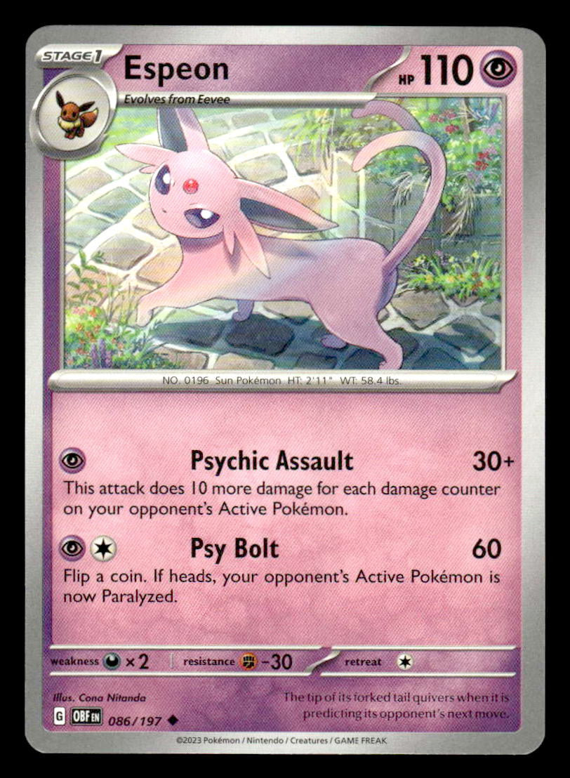 This is a nice example of a SV03: Obsidian Flames #086/197 Espeon .Other important information about this card: Uncommon.Please check out our other listings for more great cards.