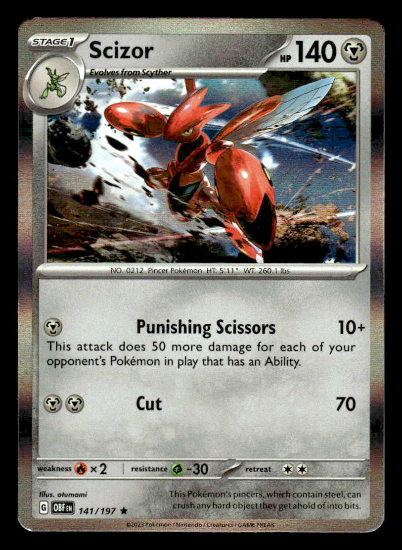 This is a nice example of a SV03: Obsidian Flames #141/197 Scizor .Other important information about this card: Rare.Please check out our other listings for more great cards.