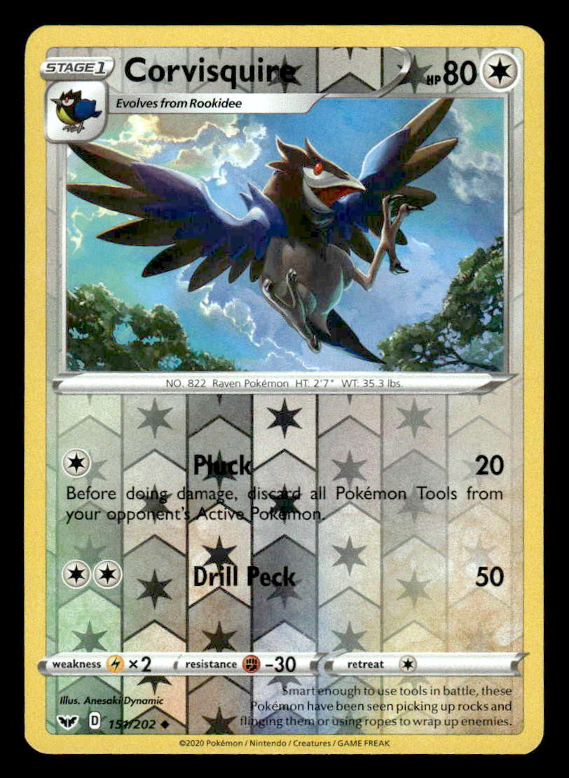 This is a nice example of a SWSH01: Sword & Shield Base Set #151/202 Corvisquire .Other important information about this card:Reverse Holo Uncommon.Please check out our other listings for more great cards.