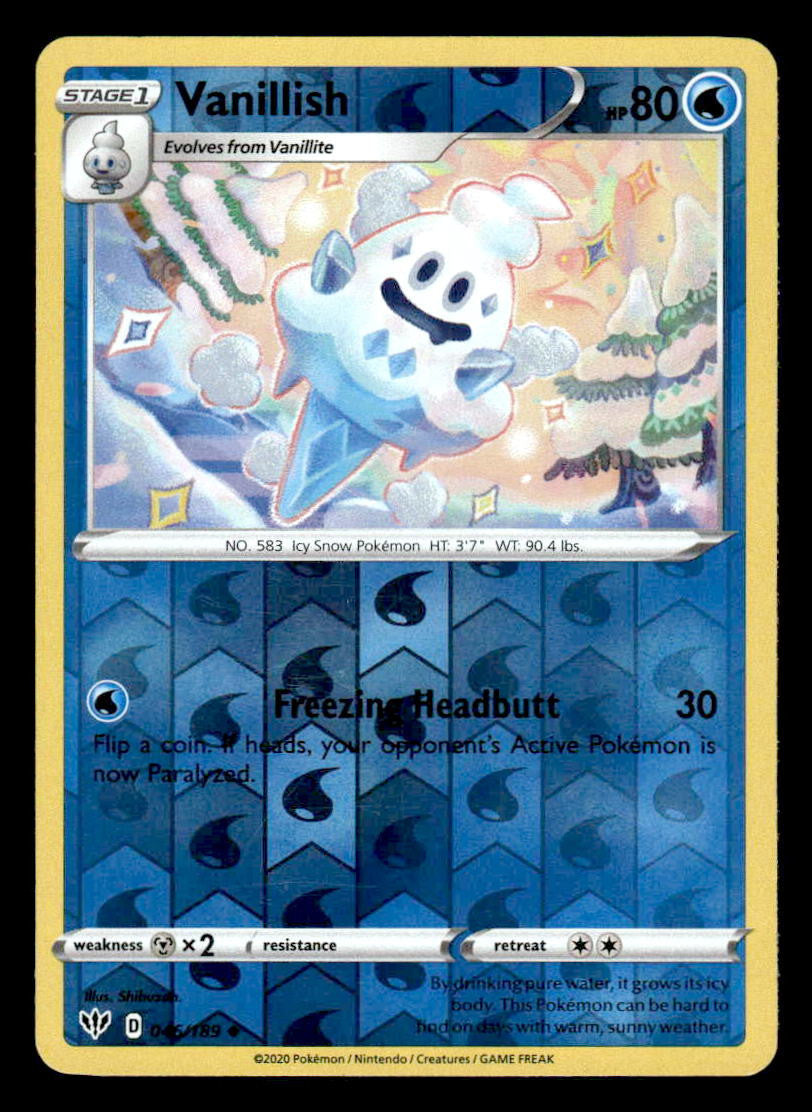 This is a nice example of a SWSH03: Darkness Ablaze #046/189 Vanillish .Other important information about this card:Reverse Holo Uncommon.Please check out our other listings for more great cards.