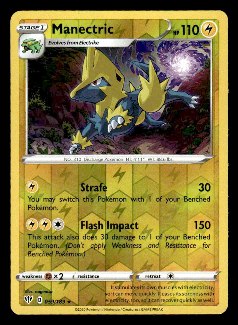 This is a nice example of a SWSH03: Darkness Ablaze #059/189 Manectric .Other important information about this card:Reverse Holo Rare.Please check out our other listings for more great cards.