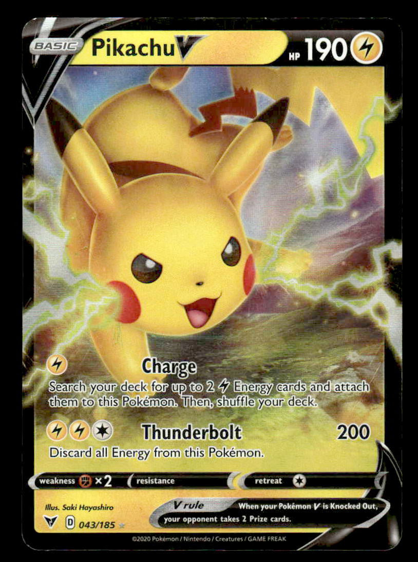 This is a nice example of a SWSH04: Vivid Voltage #043/185 Pikachu V .Other important information about this card: Ultra Rare.Please check out our other listings for more great cards.