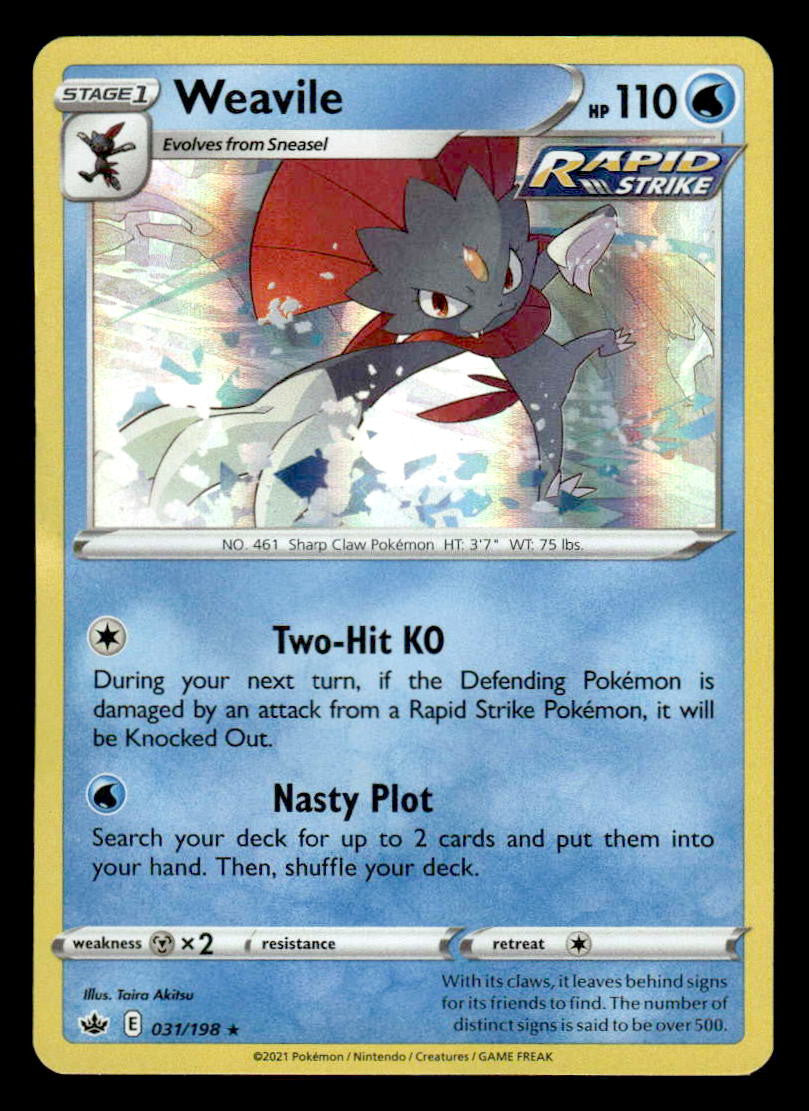 This is a nice example of a SWSH06: Chilling Reign #031/198 Weavile .Other important information about this card: Holo Rare.Please check out our other listings for more great cards.