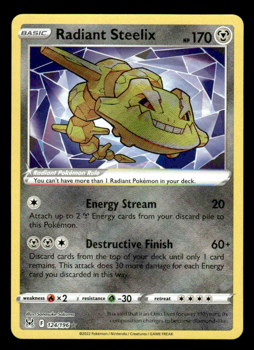 This is a nice example of a SWSH11: Lost Origin #124/196 Radiant Steelix .Other important information about this card:Holo Radiant Rare.Please check out our other listings for more great cards.