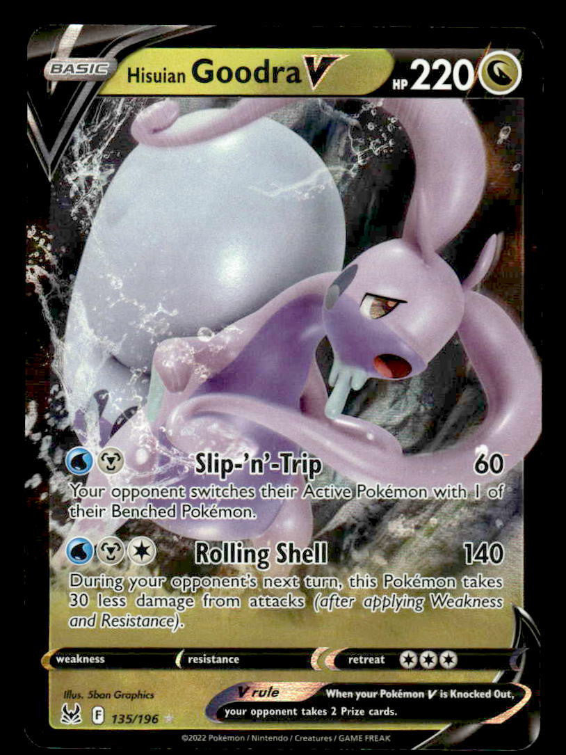 This is a nice example of a SWSH11: Lost Origin #135/196 Hisuian Goodra V .Other important information about this card: Ultra Rare.Please check out our other listings for more great cards.