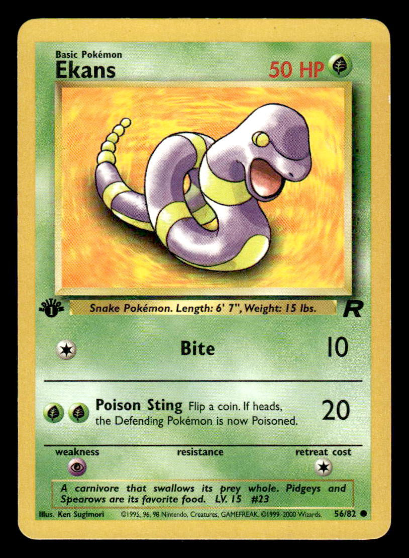 This is a nice example of a Team Rocket #56/82 Ekans .Other important information about this card: Common.Please check out our other listings for more great cards.
